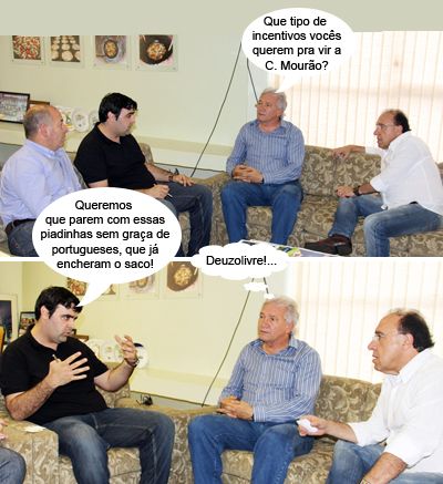 Os empresários portugueses Hermano Rodrigues e José Ferreira, que integram um grupo de empresários europeus que visam investimentos no Brasil, estiveram no gabinete do prefeito Nelson Tureck. Foram apresentar um projeto de instalação de uma indústria para a fabricação de painéis fotovoltaicos. Agora, por que será que Tureck e o secretário Alcione Jacob (Desenvolvimento Econômico) ficaram com essas caras de assustados, hein?...