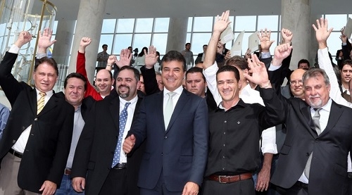 O prefeito Nei Calori (Mamborê) aparece com o governador Beto Richa. À frente está o prefeito Baco Duarte (Ubiratã).
