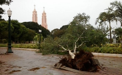 A ventania derrubou duas árvores da praça Getúlio Vargas, no centro de Campo Mourão, nesta quinta-feira. Caíram com raiz e tudo. Ai-aiai-aiai! Se não bastassem as árvores da cidade que têm sido derrubadas pelo homem, muitas sem a menor necessidade, São Pedro ainda apronta uma dessas. Como diria aquele ex-presidente, "assim não dá, assim não tem condições"...