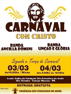 Pra quem é católico e não está a fim de curtir o carnaval tradicional, uma alternativa está na paróquia São Francisco de Assis, na Vila Teixeira (mais conhecida por jardim Gutierrez). Acontece por lá, nesta segunda e terça-feira, o "Carnaval com Cristo". Duas bandas vão animar a "folia cristã". Só não vale fantasia pagã, hein?...