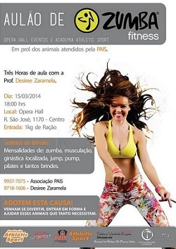 Quem tal fazer três horas de zumba fitness e ainda ajudar a Pais - Protetores dos Animais Independentes? Pois fique sabendo que isso vai acontecer neste sábado (18h), no Opera Hall. Serão três horas de aula com a professora Desiree Zaramela. Para participar basta levar 1 kg de ração para cães. E ainda concorre a brindes. Portanto, é bom pra cachorro. E pra corpo e alma também...