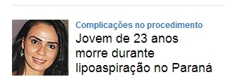 Virou destaque na página inicial do UOL, nesta quinta-feira, a morte de Jaqueline Viudes Lopes, de 23 anos, durante uma cirurgia para lipoaspiração na Santa Casa de Campo Mourão. A morte ocorreu na quarta-feira e ela foi enterrada nesta quinta, em Ubiratã, onde morava.