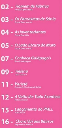 A programação segue até o dia 16, sempre às 20h, com espetáculos gratuitos de teatro, dança e de música. No dia 15 acontece o lançamento do Plano Municipal do Livro e Leitura.