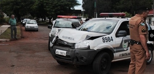 Impressionante como tem batida de carro em Campo Mourão. Nesta quarta-feira à tarde sobrou até para a Polícia Militar. Um carro cruzou a preferencial e atingiu a viatura. Foi na esquina da av. Afonso Botelho com a rua Roberto Brzezinski. Os policiais não se feriram, mas a Ecosport da PM ficou desse jeito aí. Ai-aiai-aiai! Será que o governo vai ter dinheiro pra mandar arrumar?...