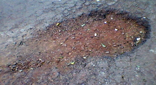 "A referida cratera está localizada em frente ao portão do Super Muffato, rua Brasil esquina com rua João Seratiuk. Já faz mais seis meses que esta essa cratera está aí. Como é esquina, está dificil até mesmo a dobrar a rua com carro, a ponto de acontecer um acidente.