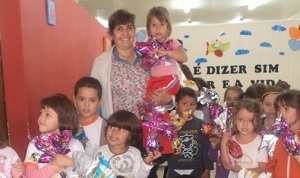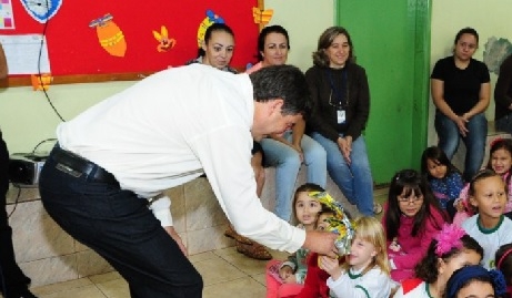 O prefeito de Luiziana, Mauro Slongo, foi à escola municipal Rita de Cássia para entrega dos caixas de bombons a 670 alunos.