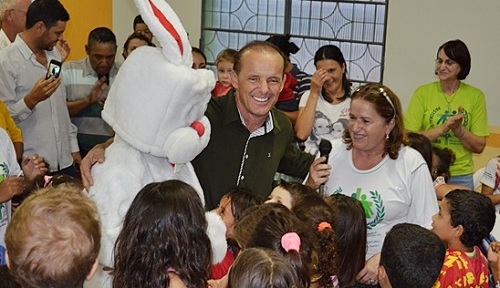 Em Moreira Sales, o prefeito Luiz Volpato fez uma marotona por escolas, creches e entidades para a engrega de ovos de chocolate.
