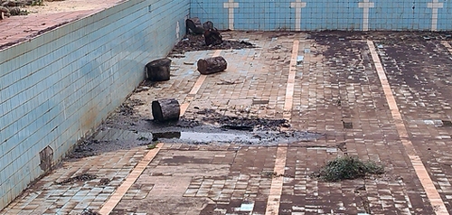 "Segue foto tirada antes das chuvas no estádio municipal. Sem contar a cena horrível da piscina abandonada, pra variar aí está o pequeno foco de dengue. Depois os responsáveis por fiscalizar a população têm coragem de bater na porta de casa para olhar o quintal".