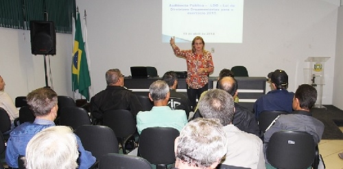 Até a prefeita Regina Dubay participou da audiência pública da Secretaria de Planejamento para debater a Lei de Diretrizes Orçamentárias de 2015. Foi nesta quarta-feira, na sala de reuniões da prefeitura. Vários representantes de bairros estiveram presentes. A LDO é quem dá base para a elaboração do orçamento. A proposta tem que ser aprovada pela Câmara.