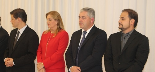 A prefeita Regina Dubay ficou na mesa principal da sessão solene ilhada por adversários políticos. De um lado, o presidente da Câmara, Pedrinho Nespolo. Do outro, o deputado Douglas Fabrício e o vice-prefeito Rodrigo Salvadori.