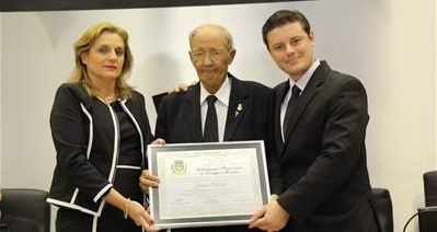 Seis dos 13 vereadores participaram nesta quinta-feira da sessão solene da Câmara que entrou o título de Cidadão Honorário de Campo Mourão a Jaime Sidnei. A entrega foi feita pelo presidente Pedrinho Nespolo, autor da proposição, e pela prefeita Regina Dubay. E cá pra nós: só por deixar os dois, assim, lado a lado, já valeu a homenagem...