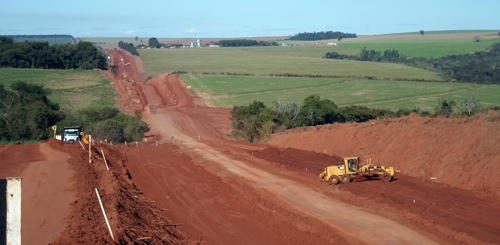 Homens e máquinas trabalham na pavimentação da centenária Boiadeira. A foto foi feita a poucos alguns quilômetros do fim do asfalto em Nova Brasília (Araruna). Desse ponto, dos 20 km até Tuneiras do Oeste, 12 km estão em obras, restanto 8 km a partir da Reserva Biológica das Perobas.