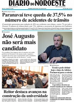 O reitor mourãoense da Unespar, Carlinhos Aleixo, foi destaque no jornal "Diário do Noroeste", de Paranavaí. Teve chamadona de capa e tudo para a matéria dele falando dos avanços da universidade. A reitoria, que ficará em Paranavaí, ainda não está pronta e Aleixo segue despachando de Curitiba. Agora, repare na manchete do jornal. O número de acidentes por lá caiu mais (37%) do que em Campo Mourão (20%). Ih, perdemos mais essa pra eles...
