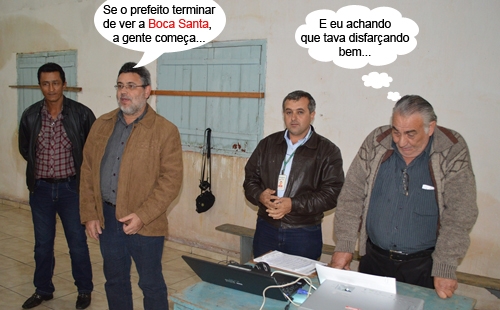 O clic é do distrito de Bragápolis, em Janiópolis, onde aconteceu audiência pública para discutir com a comunidade sobre a implantação de um sistema de abastecimento de água. Além da prefeitura, a Emater participou. O ex-prefeito Júlio Batista Guimarães, hoje secretário municipal, fala enquanto o prefeito Lola Poera confere o computador. Tá vendo a Boca Santa, não tá?...