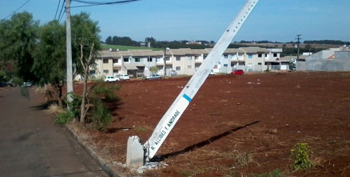 "Vejam só que situação: Este poste, localizado na rua Acides F. Andrade, esquina com a av. Manoel Nogueira , no conjunto Maria Barleta, está quebrado há mais de um mês e até agora ninguém apareceu pra fazer o conserto". Luciano de Oliveira