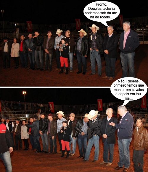Os cliques são deste domingo, em Moreira Sales, no último dia da Expo-Sales 2014. Na hora da abertura do rodeio, os deputados Rubens Bueno e Douglas Fabrício foram chamados para o interior da arena, assim como o prefeito Luiz Volpato e autoridades locais. É claro que os políticos saíram antes das montadorias. Se não, seria mais ou menos assim: Seguuuuuuura, politicaiada!...