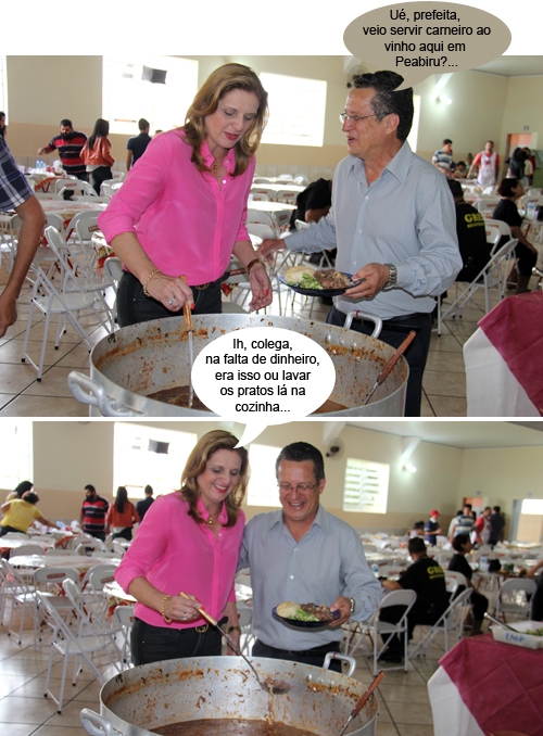 Os cliques são desde domingo, em Peabiru, onde aconteceu a 20.a Festa do Carneiro ao Vinho. Muitos políticos estiveram por lá. O prefeito anfitrião, Claudinei Minchio, recebeu todo mundo e teve a honra de ser servido pela prefeita-vizinha Regina Dubay. Ah, companheiro, é companheiro...