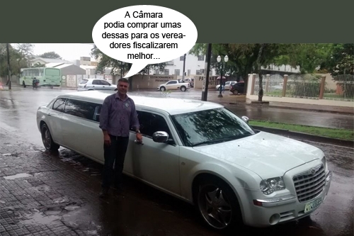 O clic é de sexta-feira, quando uma limusine passou por Campo Mourão a caminho de um casamento em Quinta do Sol. O vereador Edílson Martins não se aguentou sem chegar perto e dar uma conferida no carrão. Fez fotos internas e tudo para postar no Facebook. Também fez pose ao lado do veículo. Ah, que Tio Patinhas, que nada!...