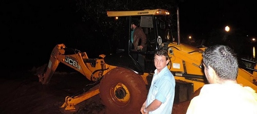 O nível do rio Tonete, em Nova Cantu, voltou a subir durante a madrugada e, outra vez, casas foram alagadas. A equipe da prefeitura teve que entrar em ação mesmo de madrugada. E olha só quem é que ficou no comando da retroescavadeira! Ele mesmo: o prefeito Airton Agnolin. Literalmente, botou o pé na lama. Ah, tá pensando o quê!...