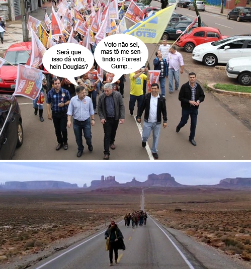 O clic é do fim de semana, quando o deputado Douglas Fabrício participou de carreata por ruas do centro de Campo Mourão. O ex-prefeito Tauillo Tezelli foi um dos presente. O vereador Sidnei Jardim, outro. Doglas foi à frente, puxando o grupo. Qualquer semelhança com o Forrest Gump, do filme, é mera coincidência...