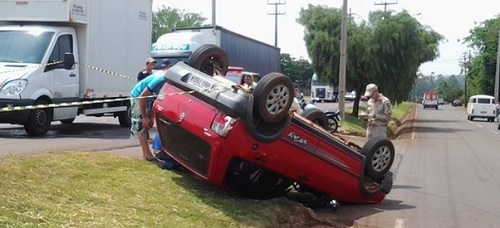 Olha aí mais um carro de rodas pra cima no trânsito de Campo Mourão. O Uno com placa de Minas Gerais ficou assim no sábado pela manhã, após acidente na av. Miguel Luiz Pereira. Tá certo que ali é ligação de rodovias, mas se trata de perímetro urbano. Menos mal que ninguém se feriu gravemente, mas carro capotado dentro da cidade é sinal que alguma coisa anda errada. E a cena tem sido tão frequente...