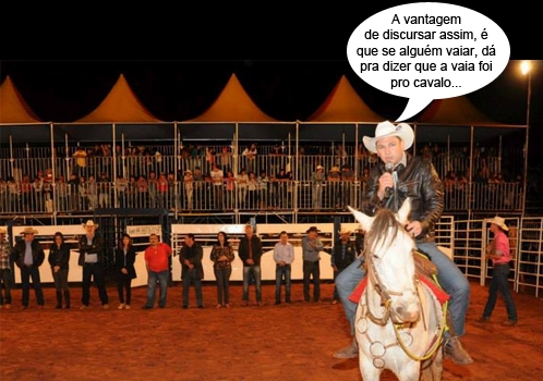O clic é de sexta-feira, na comunidade rural de Guarani, em Mamborê, onde aconteceu no fim de semana a tradicional Festa do Peão. O prefeito Nei Calori participou da abertura do rodeio, com direito a discurso no cavalo e tudo. Isso mesmo: discurso montado a cavalo. Ah, quando a gente acha que já viu de tudo...
