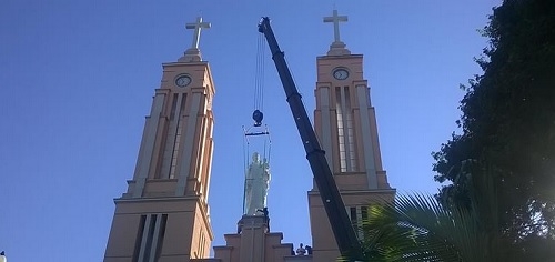 Já está colocada sobre a Catedral São José a nova imagem do santo padroeiro de Campo Mourão. A instalação foi feita na manhã desta segunda-feira, numa operação que durou cerca de uma hora. A estátua é de fibra de vidro, mede cinco metros de altura, e foi erguida por um guindaste da Coamo.