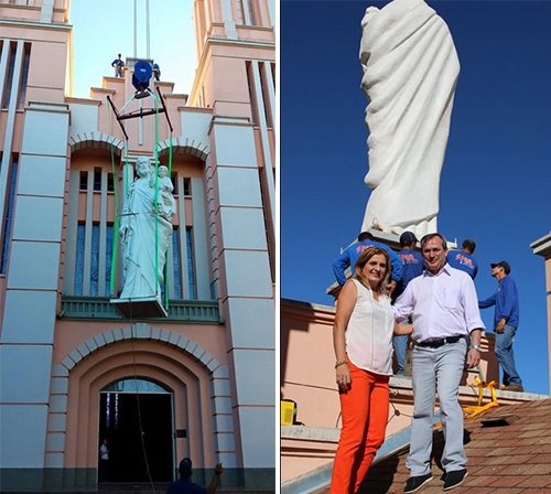 Quem estava perto da praça São José parou, na manhã desta segunda-feira, pra ver o guindaste subir a imagem de São José ao alto da igreja matriz. O santo é de fibra de vidro e tem cinco metros de altura. A prefeita Regina Dubay estava por lá e não resistiu ao convite do padre Jurandir Aguilar. Subiu ao telhado da Catedral pra ver a imagem de pertinho. Em tempo: ela subiu pelas escadas internas e não pelo guindaste, tá?...