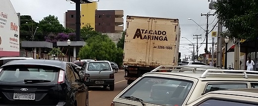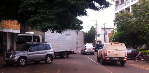 "Mais uma vez caminhão travando trânsito na frente da cidade. Rua Mato Grosso, entre mercado Paraná e nova agência do Banco do Brasil, nesta sexta-feira, às 13h35". Michael Almeida