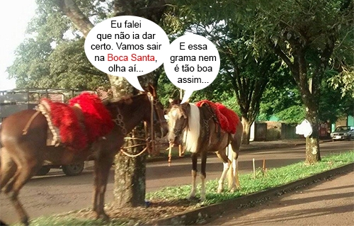 O clic é deste domingo, quando dois cavalos foram flagados amarrados numa árvore no canteiro central da av. Guilherme de Paula Xavier, em Campo Mourão. Hummm, podiam ter sido deixados num canteiro onde a grama estivesse maior, né?...