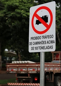 A prefeitura começou a instalar novas placas de trânsito orientando sobre a proibição do tráfego de caminhões no centro de Campo Mourão. Essa aí fica na av. Manoel Mendes de Camargo. Ela avisa que veículos acima de 10 toneladas não podem passar. A Polícia Militar diz que já vem multando os caminhões, mas sempre reclamou que faltavam placas para orientar os motoristas. Portanto, uma desculpinha a menos...
