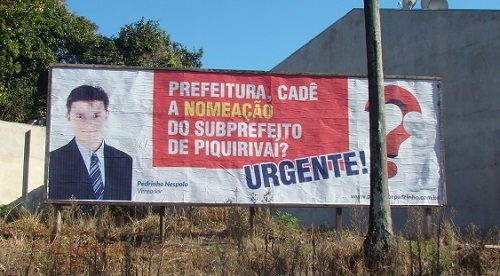 Os outdoors que o presidente da Câmara, Pedrinho Nespolo, espalhou pela cidade com críticas à prefeitura não tratam apenas de obras, não. Pelo menos um deles cobra uma nomeação. Isso mesmo: mais uma nomeação. No caso, é de um subprefeito para o distrito de Piquirivaí, que está sem. Hummmm, pode ser subprefeita?...