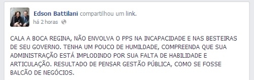 Battilani postou no Facebook um "Cala boca Regina", após comentários da prefeita envolvendo o PPS.