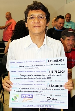 A prefeitura entregou nesta segunda-feira os certificados aprovados para a captação de recursos em 2014 através da Lei Fiscal de Incentivo ao Esporte. Dos 27 projetos apresentados, 23 foram aprovados, num total de R$ 644,5 mil. Os projetos envolvem 13 modalidades. A prefeita Regina Dubay participou do evento e fez a entrega simbólica dos "chequinhos". A Amobasquete, com três projetos aprovados, levou três "chequinhos" pra casa. Ah, digamos que foi uma "cesta de três"...