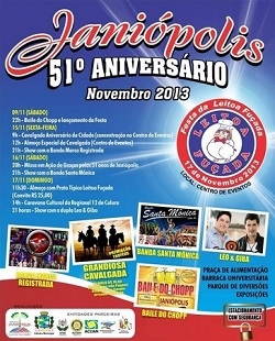 Cerca de 800 cavaleiros, segundo a organização, participaram nesta sexta-feira da 1ª Cavalgada do Aniversário de Janiópolis. Entre eles, o prefeito Lola Poeira. O evento abriu a festança dos 51 anos do município. Neste sábado tem show com a banda Santa Mônica e, no domingo, com a dupla Léo & Giba. Tudo com entrada franca, no recém inaugurado parque de exposições.