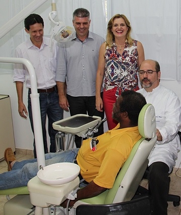A prefeitura fez nesta sexta-feira a entrega oficial de um módulo odontológico no posto de saúde da vila Guarujá. A prefeita Regina Dubay e os vereadores Edilson Martins, Toninho Machado e Nelita Piacentini estiveram por lá. Na hora da foto, coube ao líder comunitário Alcebíades Barbosa fazer a encenação com paciente. E cá pra nós: quando quem está na cadeira de dentista é outro, é sempre engraçado...