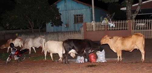 Cachorro revirando lixo? Isso é fichinha em Campina da Lagoa. Os moradores andam reclamando é de bois e vacas que ultimamente têm sido vistos pela ruas da cidade, passeando, numa boa. Isso sem contar que atrapalham o trânsito e deixam um rastro não muito agradável por onde passam. E não tem hora, pode pode ser de dia ou de noite, com na foto acima. Ô gente, se na Índia pode...