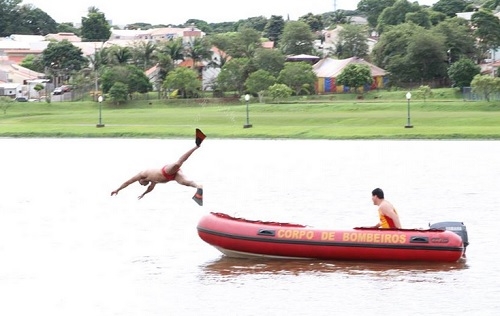 O Corpo de Bombeiros de Campo Mourão foi ao Parque do Lago nesta segunda-feira para treinar para o resgate de vítimas de afogamentos. Foram três horas de treinamento. Sabe como é que é, nessa época do ano esquenta muito, o povo sai nadando a torto e a direito por aí e acaba dando trabalho aos bombeiros. Toc, toc, toc!...