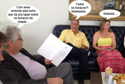 O clic vem de Goioerê, na recente visita que o senador Roberto Requião fez ao gabinete do prefeito Beto Costa. Requião parecer ler um documento do Senado enquanto Costa e a vereadora Neide Sena riem muito. Vai saber, né?...