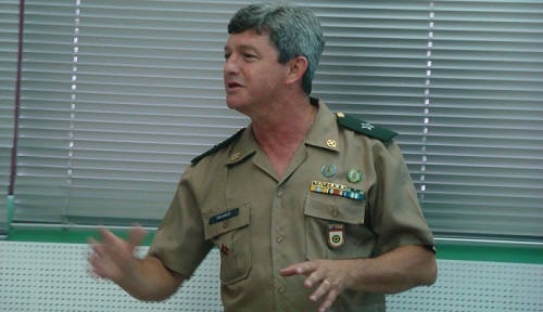 Arlei Antonio Farinon, 2.o tenente do Exército, novo comandante da 18ª Delegacia de Serviço Militar, admitindo que Campo Mourão não era sua primeira opção devido ao clima muito quente, mas que se impressionou com o recepção que teve; quarta-feira, durante reunião do Conseg.