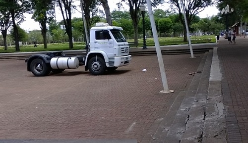 "O estrago que o caminhão fez na calçada da praça São José, no último final de semana". Marcos Fernando