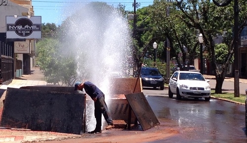 Cano de água estourado, num local onde estão sendo feitos serviços de expansão de linhas da GVT. Esquina da av. Manoel Mendes com rua Rocha Pombo. Vander Dissenha