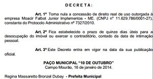 O decreto anula a concessão de direito real de uso, que foi dada no final de 2012.