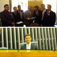Vereadores de 15 cidades da região estiveram esta semana em Brasília, numa caravana liderada pelo presidente da Acamdoze, Silvinho Sanches (Corumbataí do Sul). O tour incluiu uma romaria por gabinetes de deputados. E dê-lhe pedidos. O deputado Rubens Bueno levou o grupo inclusive ao plenário. O mourãoense Pedrinho Nespolo não resistiu sem um clic no lugar do presidente do Congresso. Ah, um dia, talvez, quem sabe...