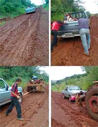 O vereador Isidoro Moraes segue se queixando da situação das estradas rurais de Campo Mourão. Desta vez ele até mostrou fotos do fim de semana no trecho da estrada que dá acesso à comunidade Fazenda Boa Esperança. Ou seja, o vereador matou a cobra e mostrou a “bicha” morta. Os cliques incluem uma camionete encalhada, que teve que ser empurrada e que só saiu mesmo puxada por um trator. E viva a adrenalina!...
