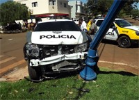 Por falar em polícia, olha só como é que ficou a viatura novinha que a Polícia Civil de Mamborê recebeu este mês das mãos do governador Beto Richa. A Duster zeradinha ficou com ao frente toda arrebentada num acidente na tarde desta segunda-feira, no centro de Mamborê. A viatura ficou detonada e ainda derrubou um poste republicano do canteiro central. Ai-aiai-aiai! Na próxima entrega melhor dar uma benzida antes...