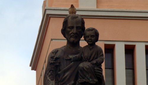 Pombinha descansa sobre a cabeça da estátua de São José, em frente à Catedral, na praça central de Campo Mourão. São José é o santo padroeiro da cidade. E a pomba, pelo visto, não tá nem aí...