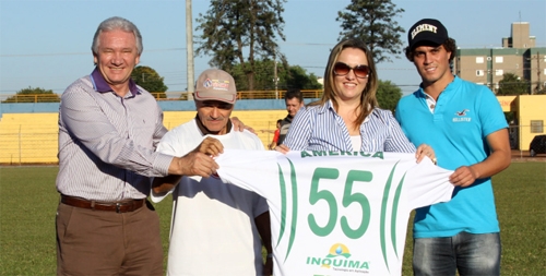 A deputada Marla Tureck foi ao estádio RB, neste domingo, conferir a semifinal do Amadorzão, entre América e Nespolo. No intervalo, ganhou uma camisa do América de presente. Número 55, o mesmo do PSD. Estão no clic, o ex-prefeto Nelson Tureck, o presidente do América, Enoque Lourenço; e o técnico do time, Gabriel Zanata, que também é assessor da deputada. Olha aí, o presidente da Câmara, Pedrinho Nespolo, não deu a camisa do Nespolo pra Marla e o time perdeu pro 2 a 0...