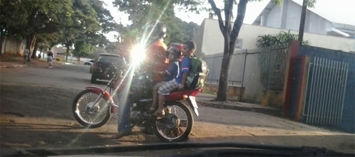 “Escola educa e pai deseduca. Pai flagrado buscando filhos na escola. Além de estar com excesso de passageiro em sua moto, um dos filhos vai embora sem a proteção do capacete. Só Deus para proteger mesmo!”