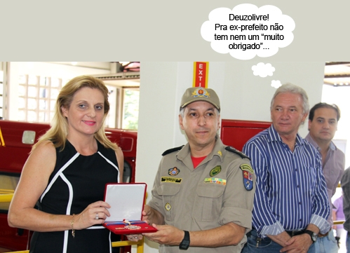 O clic é da solenidade desta sexta-feira no Corpo de Bombeiros de Campo Mourão. O comandante do 5º Grupamento, tenente-coronel Zanlucas, entregou uma placa à prefeita Regina Dubay em comemoração aos 100 anos do Corpo de Bombeiros do Paraná. O ex-prefeito Nelson Tureck, que representou a deputada-filha Marla Tureck, só olhou. Ah, vida de “ex” é assim. O máximo que ganha é contas rejeitadas do TC...